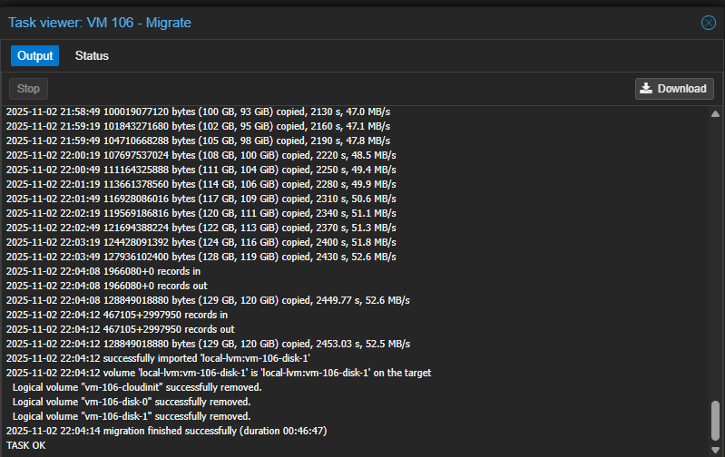 Migrating VMs takes a long time for the K3s nodes dedicated to storage. Each of those VMs has a large disk reserved specifically for Longhorn:
